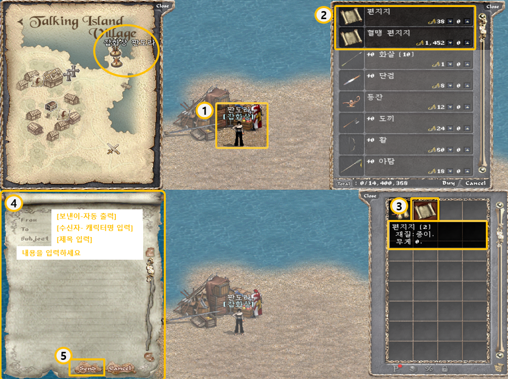 - Thư được gửi bằng cách sử dụng giấy viết thư hoặc giấy viết thư bang hội mua từ NPC tạp hóa